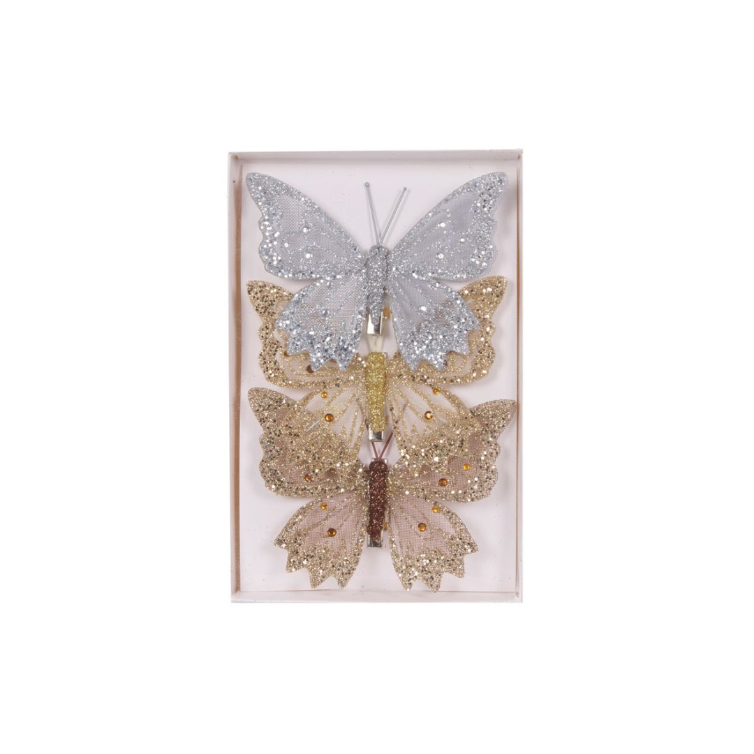 Add a sparkling, whimsical touch to your Christmas décor with this 3-pack of Mixed Metallic Glitter Butterflies from Holly and Ivy. Featuring silver, gold, and champagne tones, each butterfly comes with a clip for easy attachment to your tree, garlands, or festive arrangements. Perfect for adding shimmer, movement, and a delicate festive accent throughout your holiday styling.